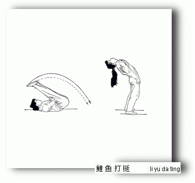 "Лиюйдатин" - подъём-разгибом: энергичный мах ногами с осью вращения в тазобедренном суставе, направленный под углом вверх, ладони на передней поверхности бедер